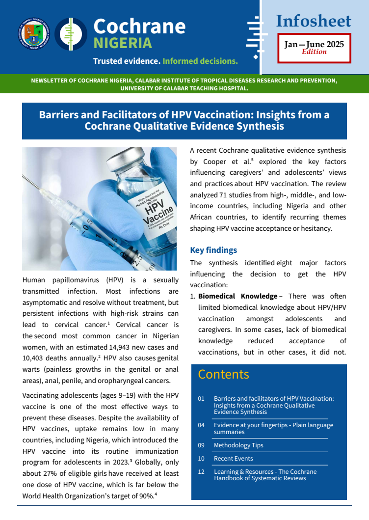 Cochrane Nigeria publishes a quarterly newsletter - the Cochrane Nigeria Info Sheet. Click on the links in the sidebar or here to view current and previous editions.
